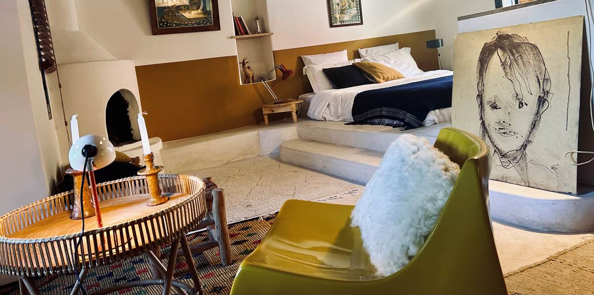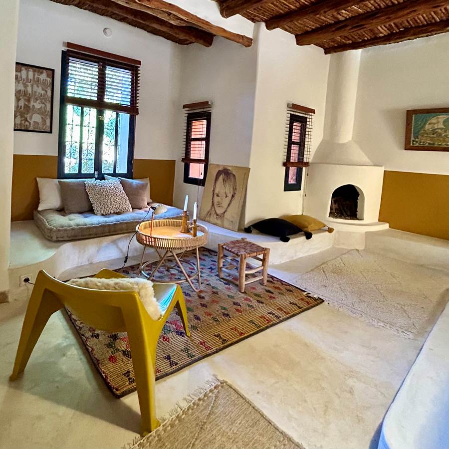 Anciennement la chambre Rouge, cette grande chambre double donnant sur le patio et le jardin a été rénovée en décembre 2025. En Berbère Akal signifie "terre", la décoration est un délicieux mélange de matériaux nobles tel que le bois et la laine, auxquels s'ajoutent du mobilier vintage et des objets chinés ici et ailleurs. Un cocon chaleureux pour les amoureux, avec un coin salon, une cheminée, un bureau et une salle de bain avec une baignoire douche ronde composé en tadelakt et zelliges traditionnels.