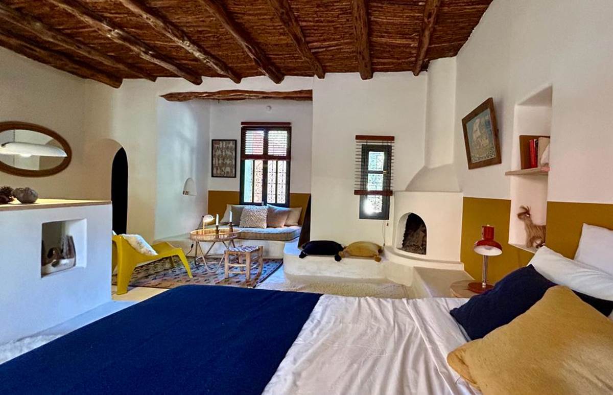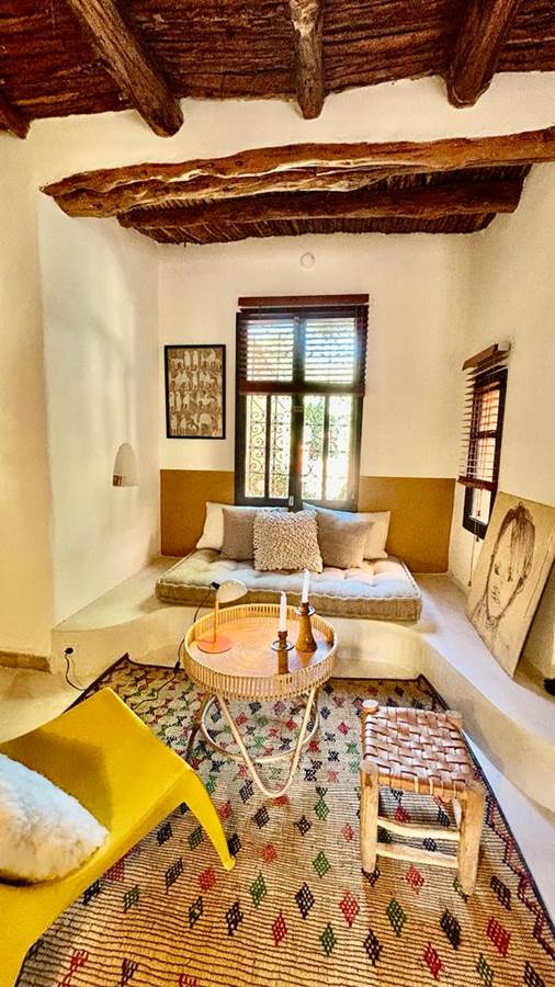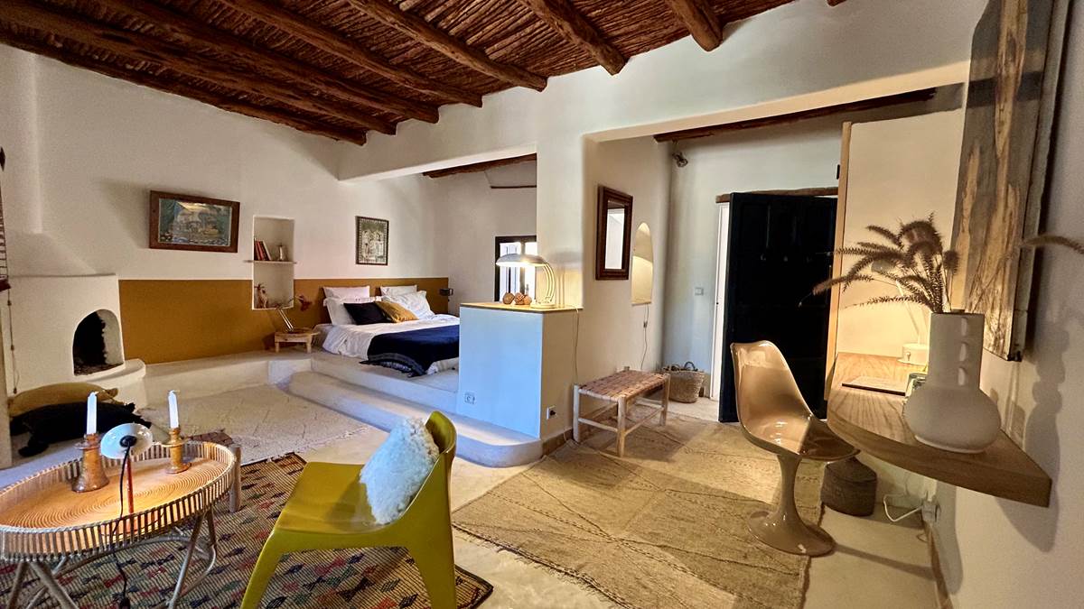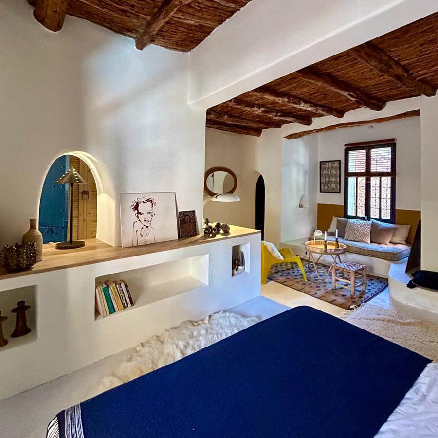 Anciennement la chambre Rouge, cette grande chambre double donnant sur le patio et le jardin a été rénovée en décembre 2025. En Berbère Akal signifie "terre", la décoration est un délicieux mélange de matériaux nobles tel que le bois et la laine, auxquels s'ajoutent du mobilier vintage et des objets chinés ici et ailleurs. Un cocon chaleureux pour les amoureux, avec un coin salon, une cheminée, un bureau et une salle de bain avec une baignoire douche ronde composé en tadelakt et zelliges traditionnels.