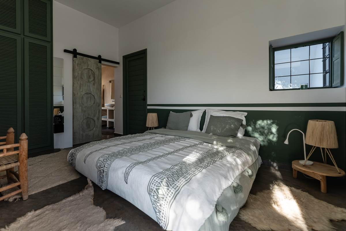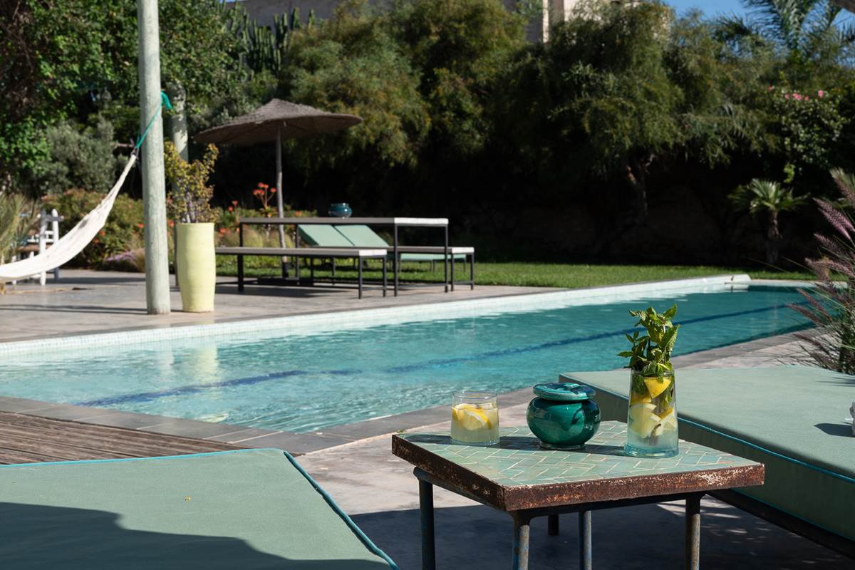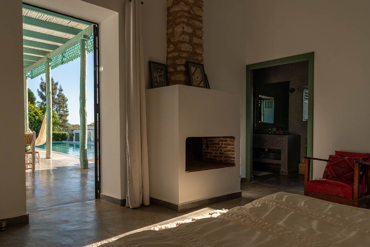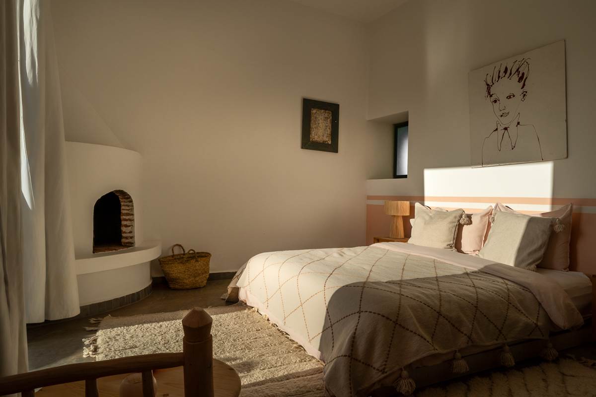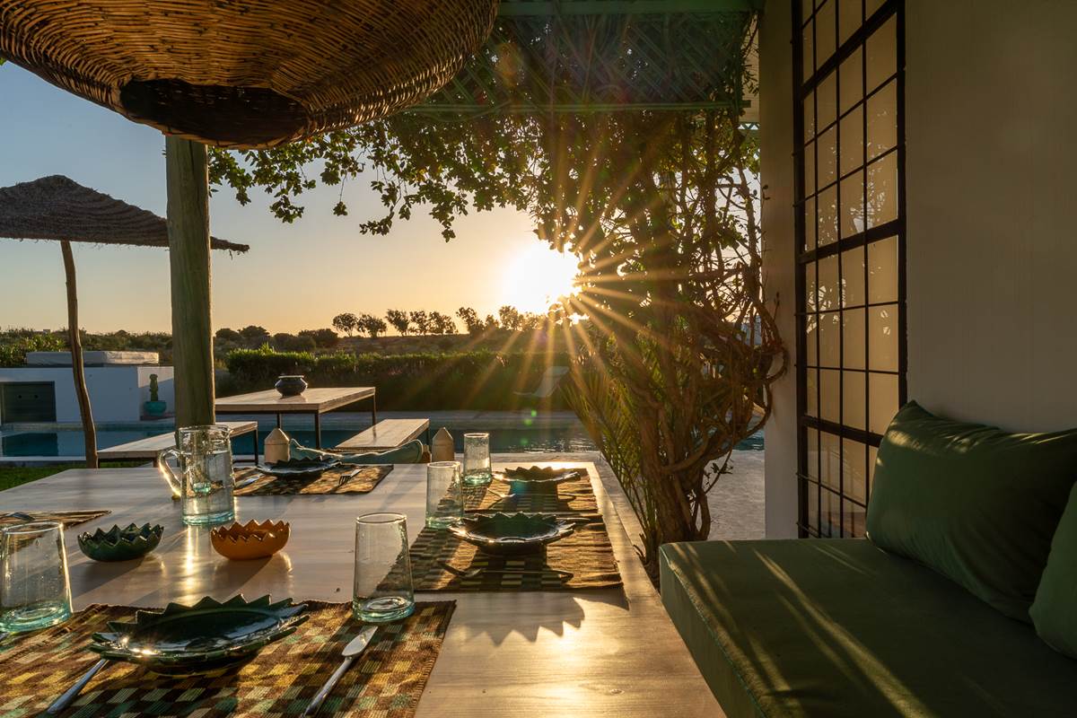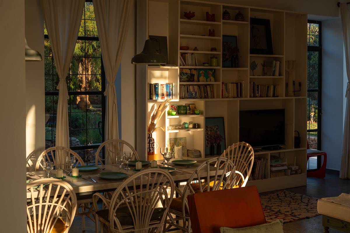 Nichée au cœur d'un vaste jardin arboré de 1 500 m², elle offre un cadre paisible au style unique mêlant mobilier vintage et artisanat marocain créant une atmosphère chaleureuse et authentique avec une vue dégagée sur la campagne et de magnifiques couchers de soleil.