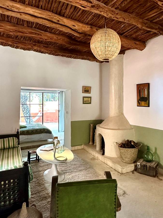 It consists of a living room with sofa and fireplace, a large master bedroom opening onto a private terrace and the garden, a second bedroom with a double bed for children and adults, and a bathroom with walk-in shower and separate toilet.
