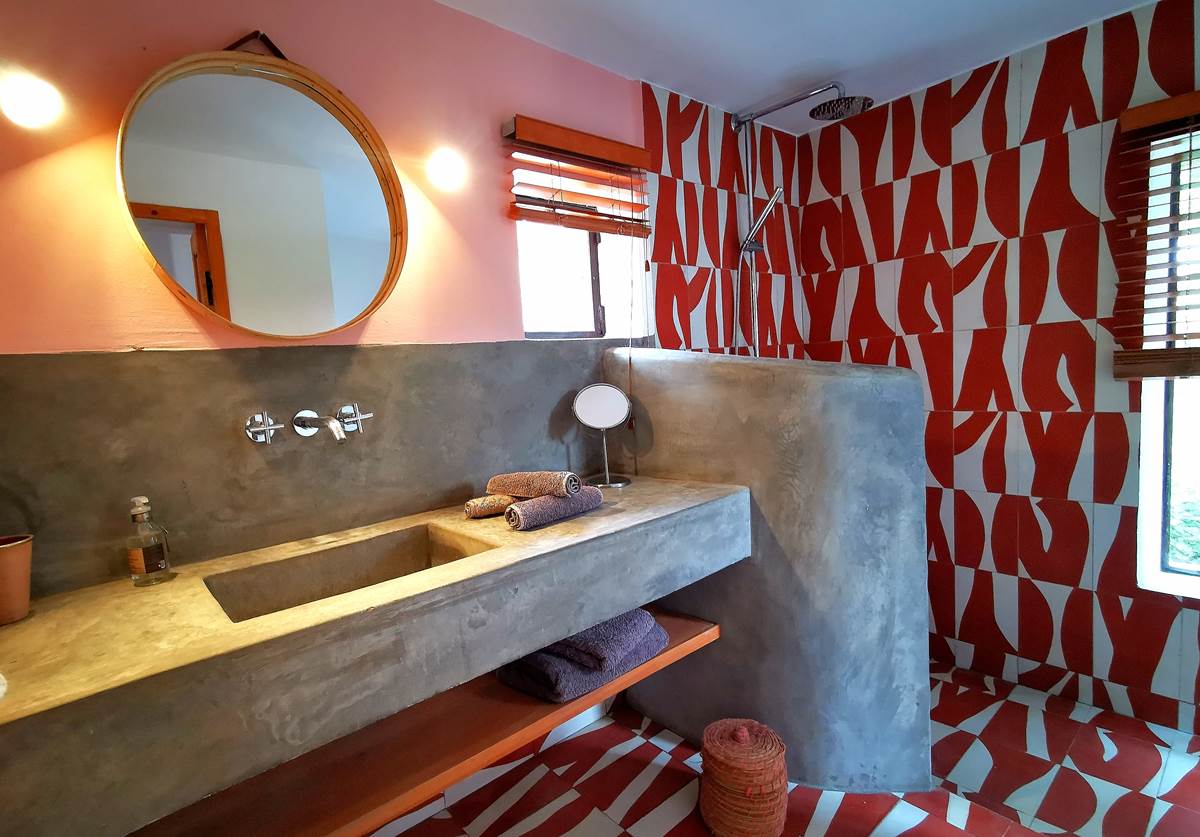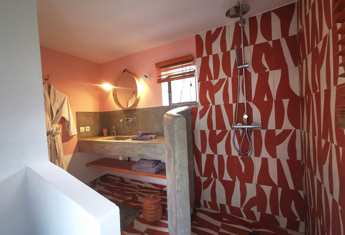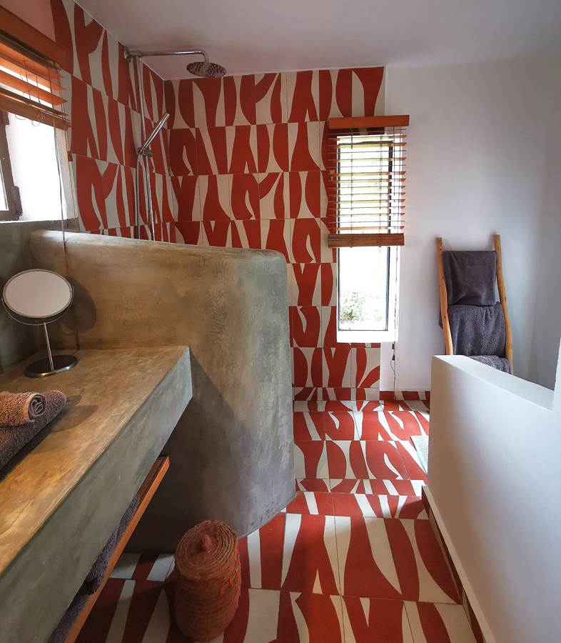 • Walk-in shower with traditional cement tiles