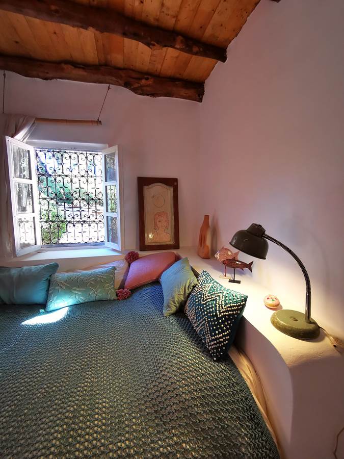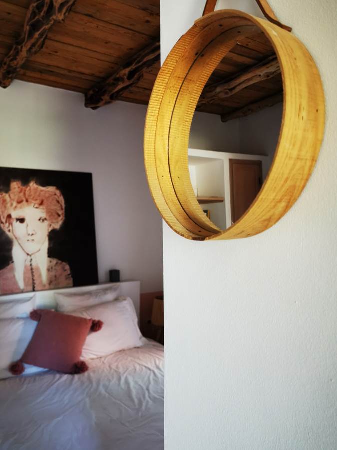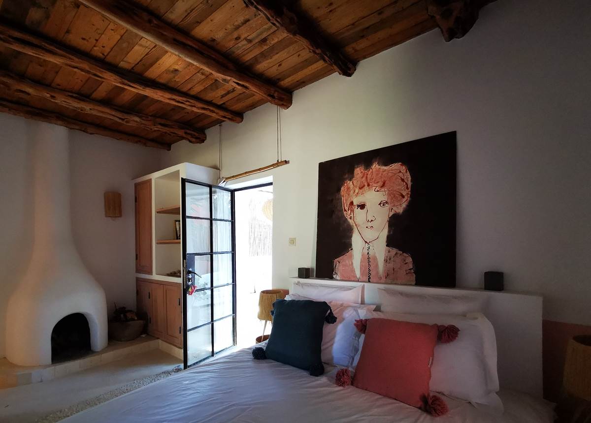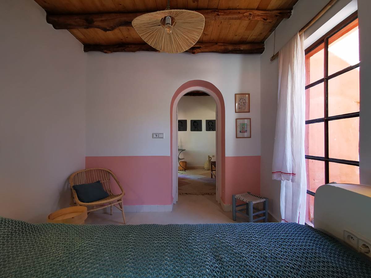 It comprises a double bedroom with a fireplace and desk area, and a second bedroom with a double bed. Bathroom with a walk-in shower in traditional cement tiles.